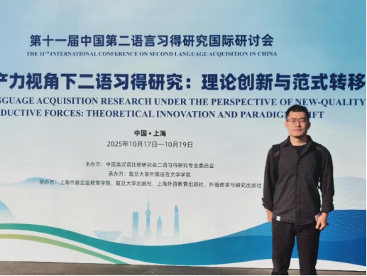 2025年10月17~19日,由中国英汉语比较研究会二语习得研究专业委员会主办、复旦大学外国语言文学学院承办的“第十一届中国二语习得研究国际研讨会” 在上海举行。本次研讨以“新质生产力视角下二语习得研究:理论创新与范式转移”为主题,吸引了来自全国80余所高校的约400余名专家学者及研究生齐聚一堂,开展深入交流与研讨。我院教师杨晓峰应邀参会。