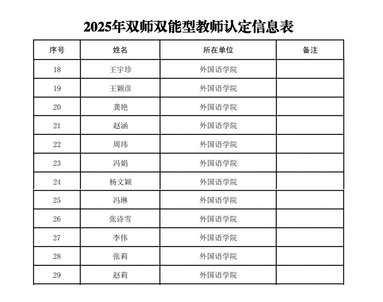 根据宝文理院人字〔2025〕24号文件《关于公布2025年“双师双能型”教师认定名单的通知》,经个人申报、二级单位初审推荐、学校相关部门审核、校内公示无异议,2025年学校认定“双师双能型”教师共计48人,其中我院12名教师获得认定,具体名单如下: