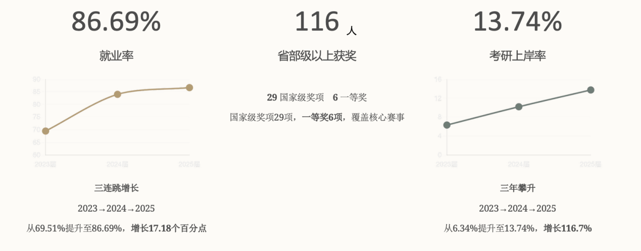 在升学与就业协同推进方面,学院将考研指导纳入全过程培养体系,系统开展动员部署、分类指导和经验交流,考研录取人数和录取率连续三年稳步攀升,人才培养质量持续向好。