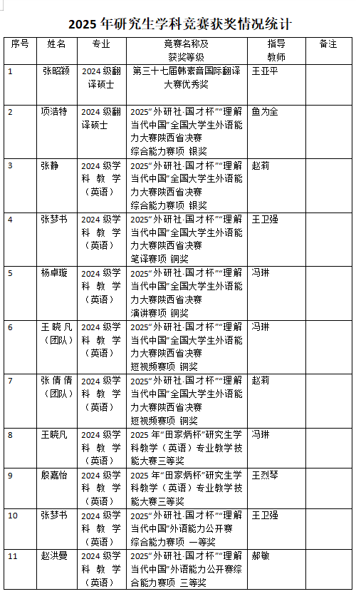 学院研究生教育规模稳步扩大,在校生达116人。通过持续完善人才培养方案、优化课程体系、强化见习实习等实践环节,顺利通过教育硕士评估与翻译硕士点评估,以评促改提升培养质量。全年成果颇丰:“师道传承·匠心育人”学科英语导学团队获评校级“优秀研究生导学团队”,斩获校级研究生教育教学成果奖二等奖1项;学生在省级以上学科竞赛中表现亮眼,获得一等奖3项、二等奖2项、三等奖9项;2023级翻译硕士凭借扎实专业能力获实习单位书面表扬。