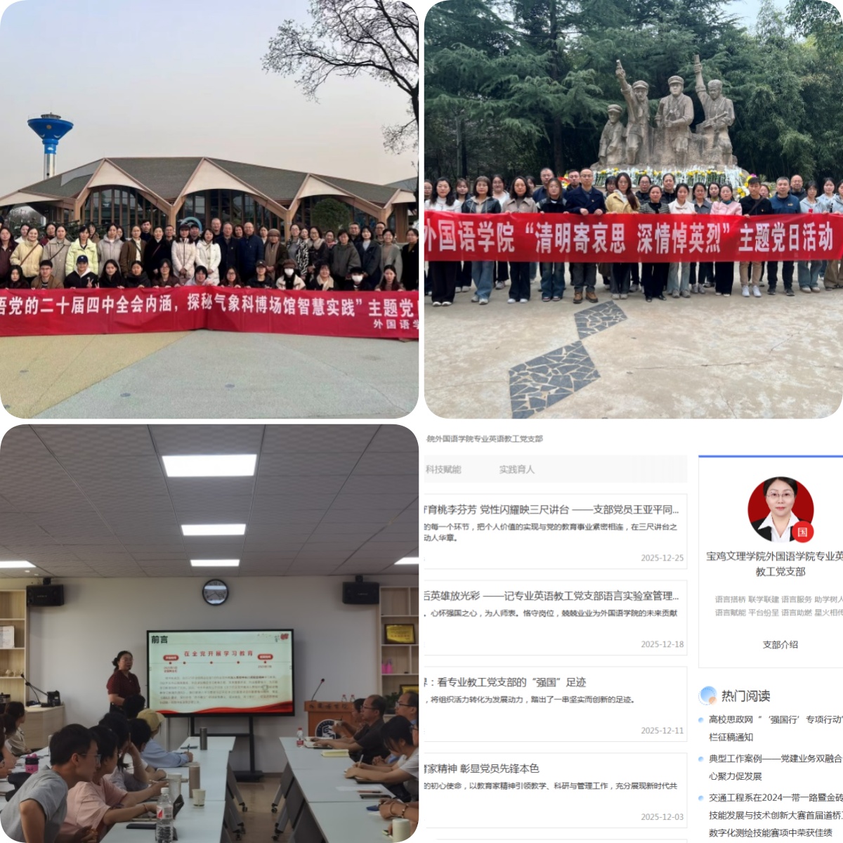 2025 年,外国语学院以党建为引领,深耕思想政治教育阵地,扎实开展党的二十届四中全会精神、中央八项规定精神专题学习,通过专题班研学、宣讲会精学、“三会一课”常学、主题党日活动践学等形式推动理论学习入脑入心,同步深化师德师风建设,厚植中华优秀传统文化、革命文化、社会主义先进文化育人底蕴,引导师生筑牢思想根基。党建实践持续深化,专业英语教工党支部“双带头人”教师党支部书记“强国行”专项行动稳步推进,以“党建领航产学研,科技赋能强国行”为导向,在党建联建、教育服务等方面成果丰硕;学生第二党支部争先进位为“Ⅰ类”样板支部,支部战斗堡垒作用进一步凸显;学院顺利完成5个党支部换届选举,选优配强支部委员,为党建工作注入新活力;挖掘身边党员的先进事迹,树立可学可及的榜样,评选“我身边的旗帜党员”5人,营造全院形成“向先进看齐”的良好氛围,有效激发党员群体的责任意识,学生党员在第六届陕西高校团干部素质能力大赛决赛中荣获学生团干部组二等奖。廉洁文化建设亮点纷呈,学院打造“双语廉韵坊”特色品牌,圆满完成开设“党史上的清廉故事”线上专栏和排演英文廉洁话剧等 “六个一” 建设项目,将廉洁教育与外语专业特色深度融合,营造崇廉拒腐的良好风尚。党建引领下的思想建设、组织建设与廉洁建设协同发力、一体推进,为学院高质量发展提供坚强政治保障。