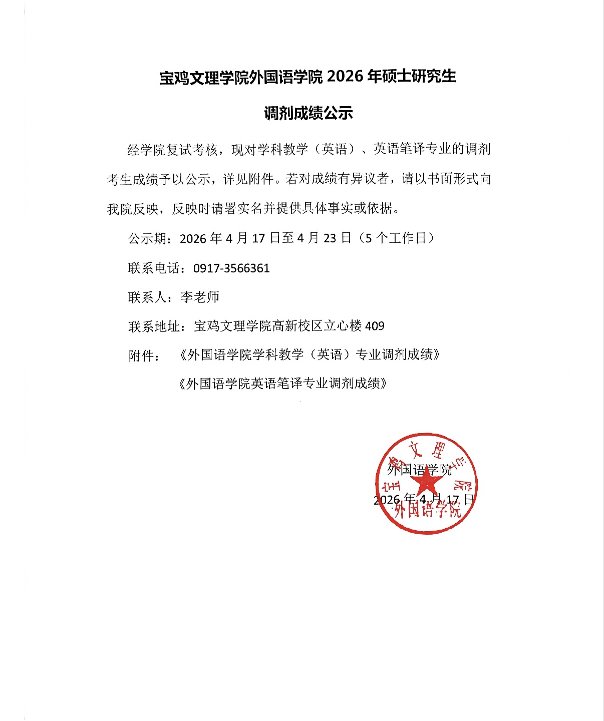 宝鸡文理学院外国语学院2026年硕士研究生调剂成绩公示