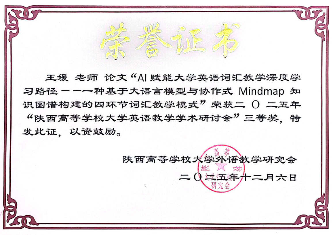 为深化新时代大学英语教学改革,积极探索人工智能(AI)时代外语教学的创新发展路径,由陕西高等学校大学外语教学研究会主办、陕西理工大学承办的2025年大学英语教学学术研讨会于12月5日至7日在陕西汉中隆重召开。来自全省各高校200余名外语教学专家、骨干教师代表齐聚一堂,围绕“人工智能赋能、跨学科融合、课程思政建设”等核心议题展开深度研讨与经验交流。我院大学外语部主任张雨副教授带领王媛、吴月两位青年骨干教师参会。王媛老师提交的学术论文《AI赋能大学英语词汇教学深度学习路径——一种基于大语言模型与协作式Mind map知识图谱构建的四环节词汇教学模式》,以兼具创新性与实践性的研究设计脱颖而出,荣获本次教学研究会学术论文三等奖。