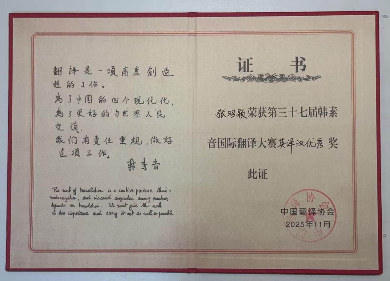 近日,第三十七届韩素音国际翻译大赛获奖名单正式公布。我院24级英语笔译研究生张昭颖(指导教师:王亚平)荣获英译汉优秀奖。
